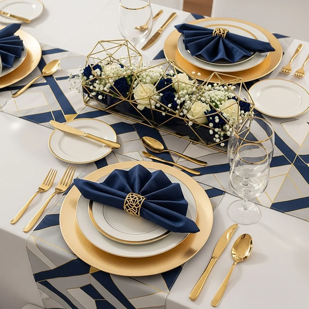 Transform ordinary table settings into beautiful displays with eye-catching tablecloths, place settings, and napkin arrangements. Incorporate elements that match your theme, like geometric centerpieces or a specific color palette, to keep everything cohesive.