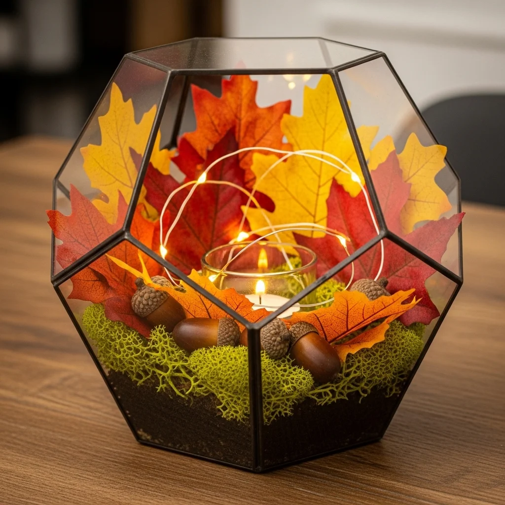 Create a glass terrarium filled with autumn leaves, acorns, and decorative moss. This centerpiece brings the beauty of nature indoors and serves as a captivating focal point. Add a small votive candle or fairy lights inside for a magical touch.