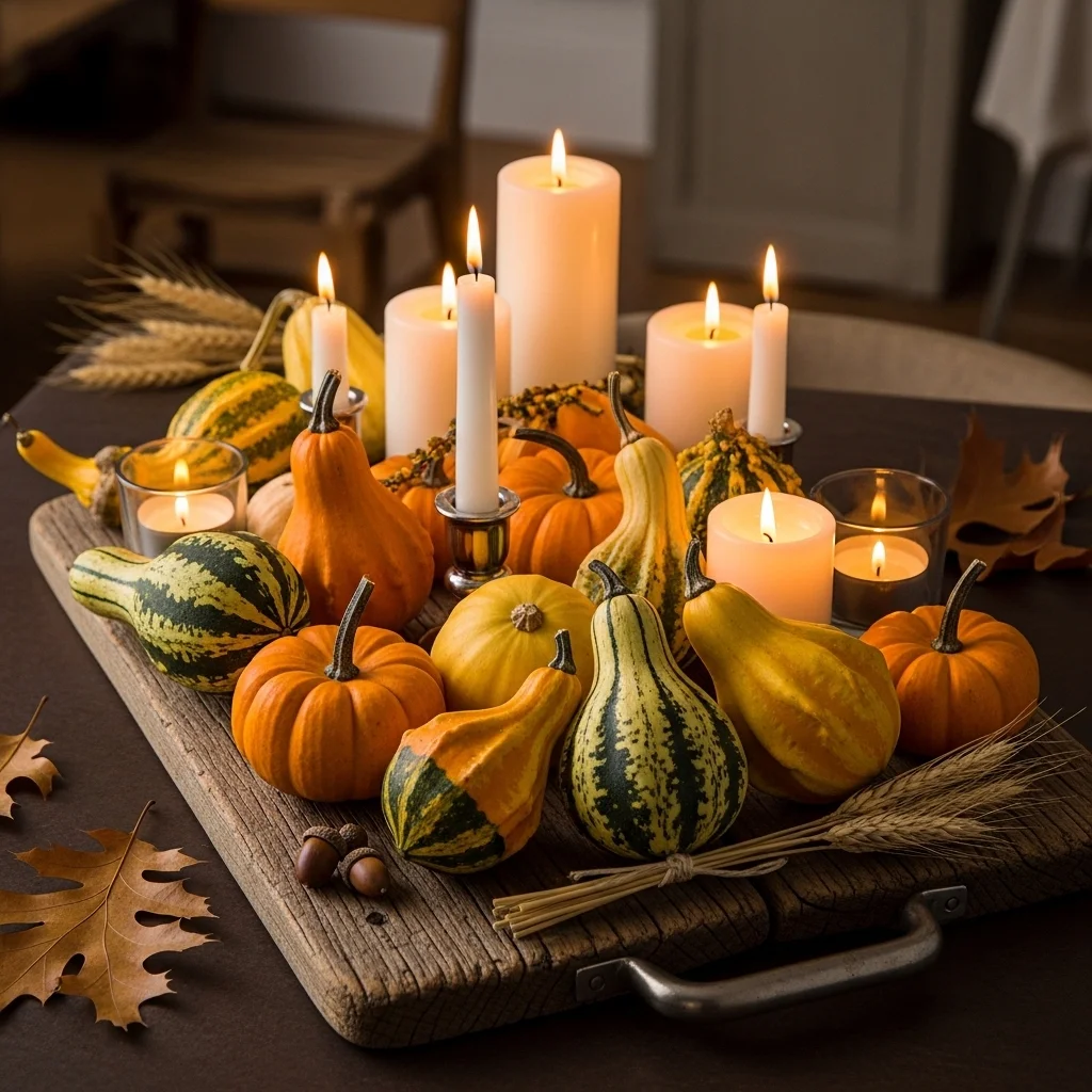 Create a stunning display using a mix of small gourds and pumpkins in varying shapes, sizes, and colors. Incorporate candles of different heights for added warmth. Arrange them on a rustic wooden serving board or a woven mat for a cozy, harvest-inspired feel.
