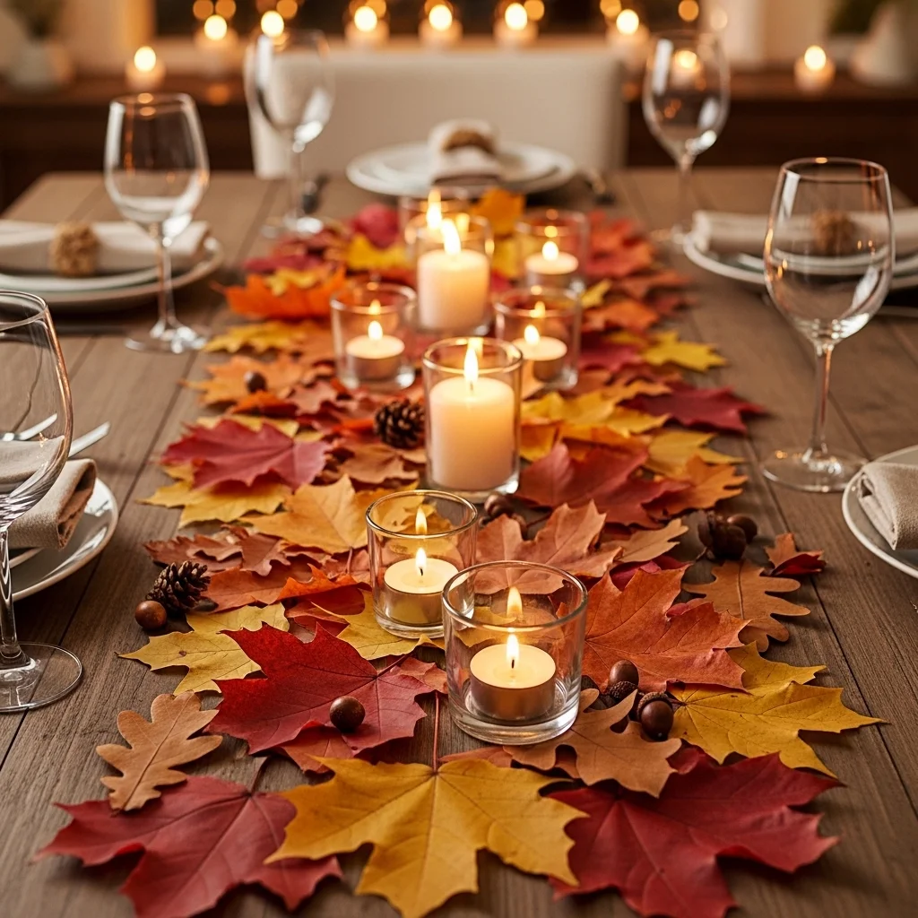 Craft a unique table runner made of colorful autumn leaves. Spread them along the center of the table and place small tea lights or votives among the leaves for a soft glow. This centerpiece is simple yet stunning in its celebration of fall.