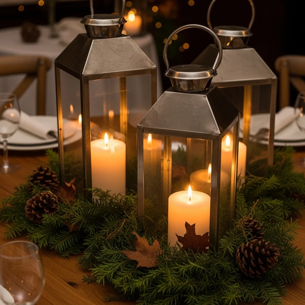 Use metal lanterns filled with candles and surrounded by seasonal greenery. This creates a warm glow that enhances the ambiance of any gathering. You can also add elements like pinecones or dried leaves for a more autumn feel.