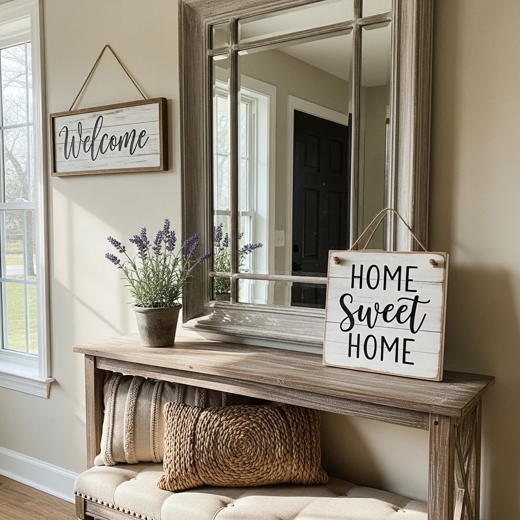 Add personalized touches with farmhouse-style signage. Consider wooden signs with welcoming phrases like “Welcome” or “Home Sweet Home.” These pieces can be hung above the bench or placed on a console table for a charming touch.