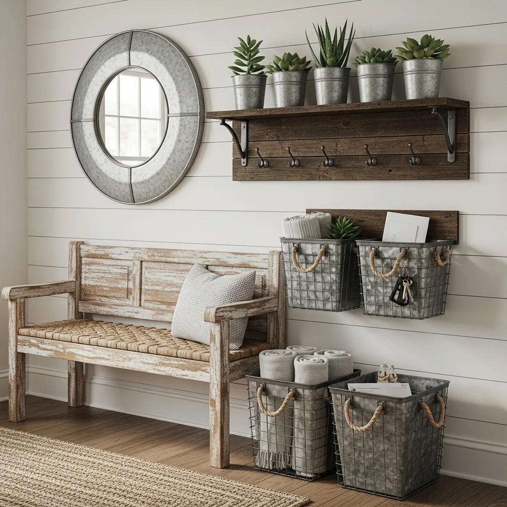Incorporate galvanized metal elements to introduce an industrial touch to your farmhouse theme. Think metal baskets, planters, or even a wall-mounted shelf. These items not only enhance the decor but also provide functional storage solutions, keeping your entryway organized.