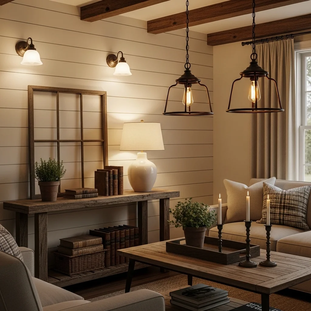 Lighting can dramatically change the mood of any space. Incorporate layered lighting with a mix of ambient and accent lights. Use farmhouse-style pendant lights or vintage-inspired sconces to create a warm glow. Adding a table lamp on a console table can also offer soft illumination in the evenings.