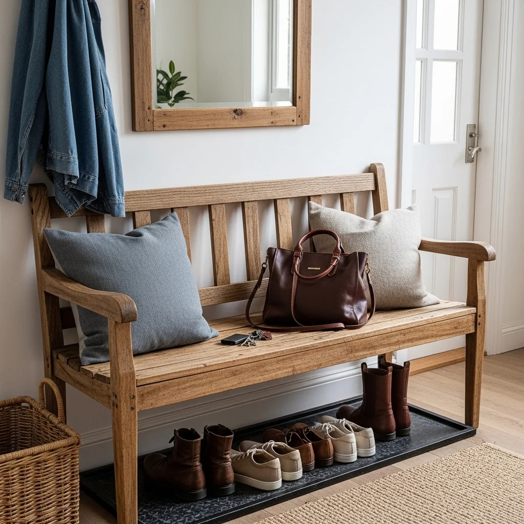 A vintage or reclaimed wood bench can serve as a functional and stylish addition to your entryway. Use it as a place to sit while putting on or taking off shoes, or as a surface to drop bags and keys. Complete the look with a few cozy cushions for additional comfort.