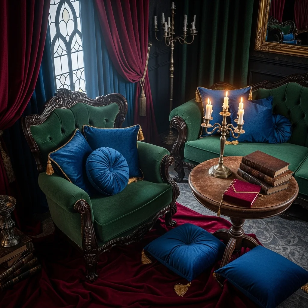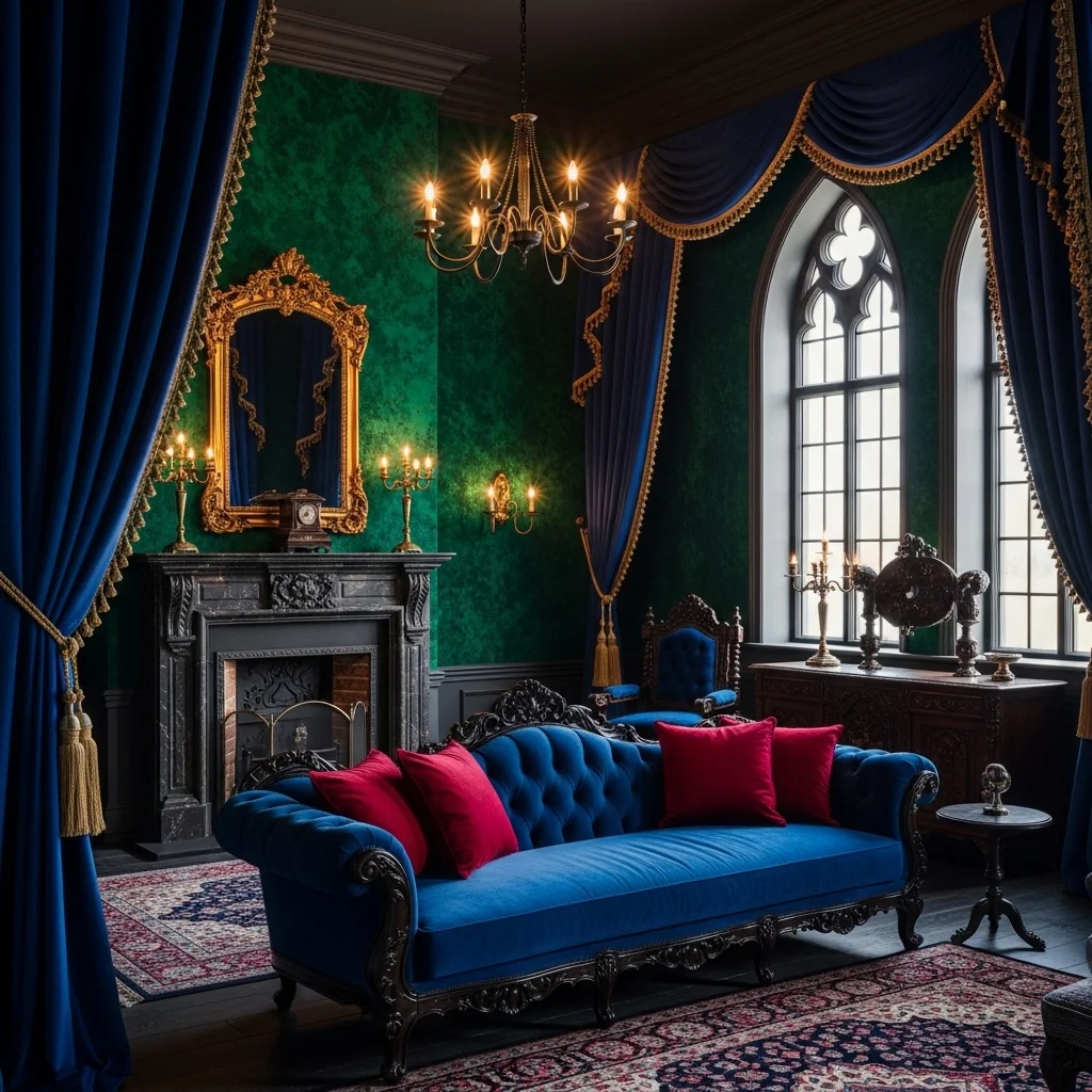Rich and luxurious, deep jewel tones such as emerald green, sapphire blue, and ruby red serve as the perfect backdrop for Gothic interiors. These colors can be incorporated through accent walls, upholstery, or accessories, setting a mood that is both dramatic and cozy.