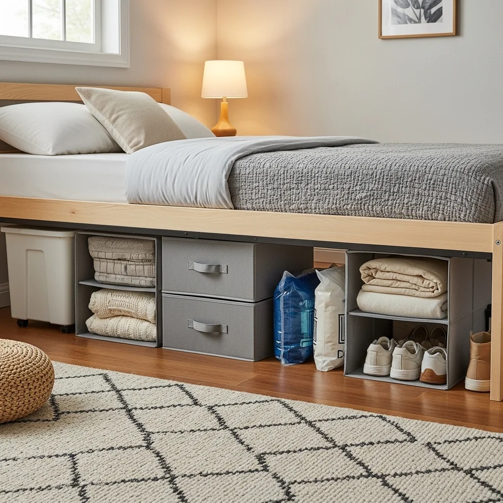 Don’t overlook the space under your bed! Use rolling bins, drawers, or vacuum-sealed bags to store seasonal clothing, shoes, or other items that you don’t need to access daily.
