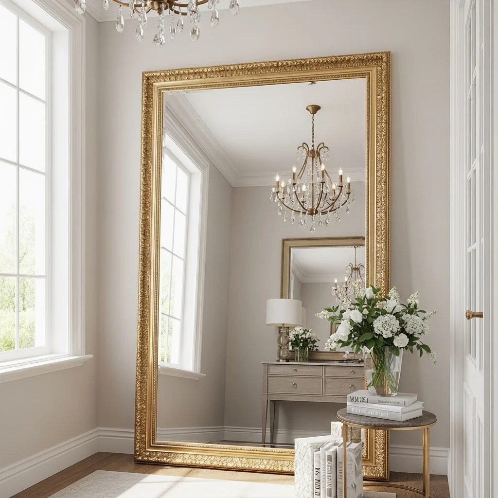Oversized mirrors can make a small space feel larger while adding elegance. A grand, framed mirror can reflect light and enhance the ambiance. Position it strategically to make the most of natural or artificial lighting.