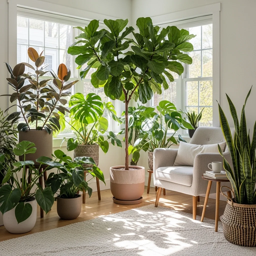 Incorporate oversized greenery to bring life and texture into your space. A large potted tree, such as a fiddle leaf fig or a rubber plant, can serve as a compelling centerpiece and improve air quality at the same time.