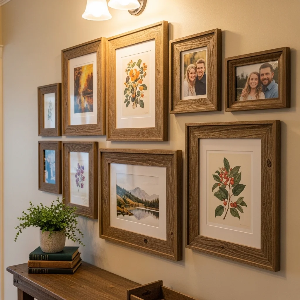 Use rustic wooden frames to display art prints or family photos. These natural frames can provide a cozy and inviting look, perfect for hallways or living rooms.