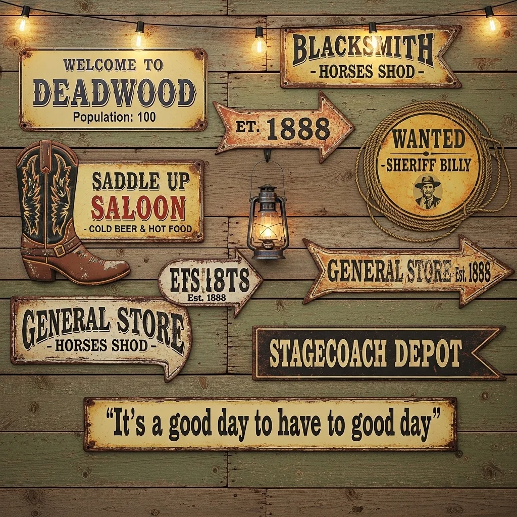 Add character and nostalgia with vintage Western signs. Whether they advertise local businesses or feature famous cowboy quotes, these decorative pieces can add a pop of color and storytelling to your walls.