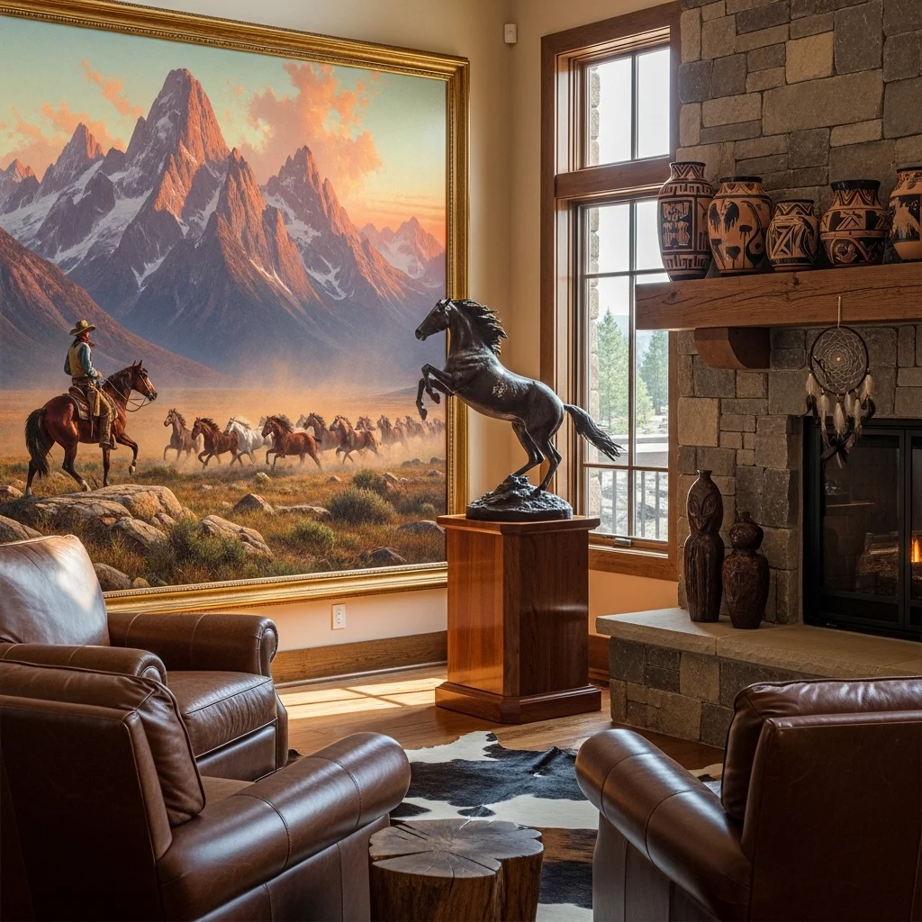 Art plays a crucial role in defining your space’s character. Consider investing in paintings or prints depicting western landscapes, cowboy life, or Native American art. Sculptures of wild horses or other native wildlife can also be great statement pieces.