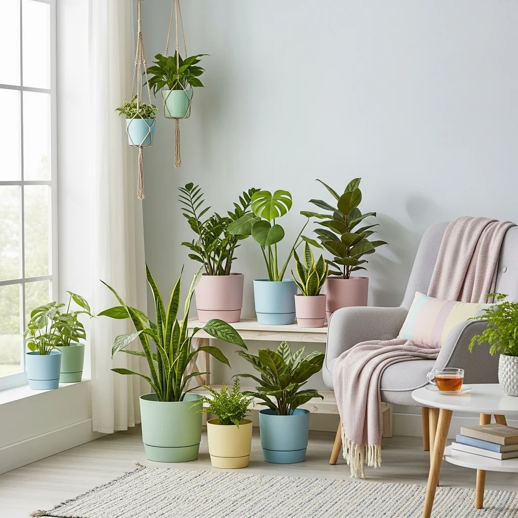 Incorporate plants in pastel pots for a refreshing touch. Paler colored planters not only contrast beautifully with lush green foliage but also contribute to the overall serene aesthetic of your room.