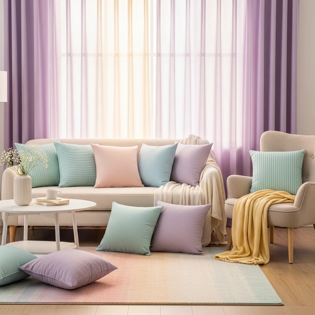 Layer soft pastel textiles throughout your home. Think throw pillows in varying pastel shades on a neutral sofa, a light pastel rug underfoot, or curtains in light lilac to let natural light filter gently into the room.