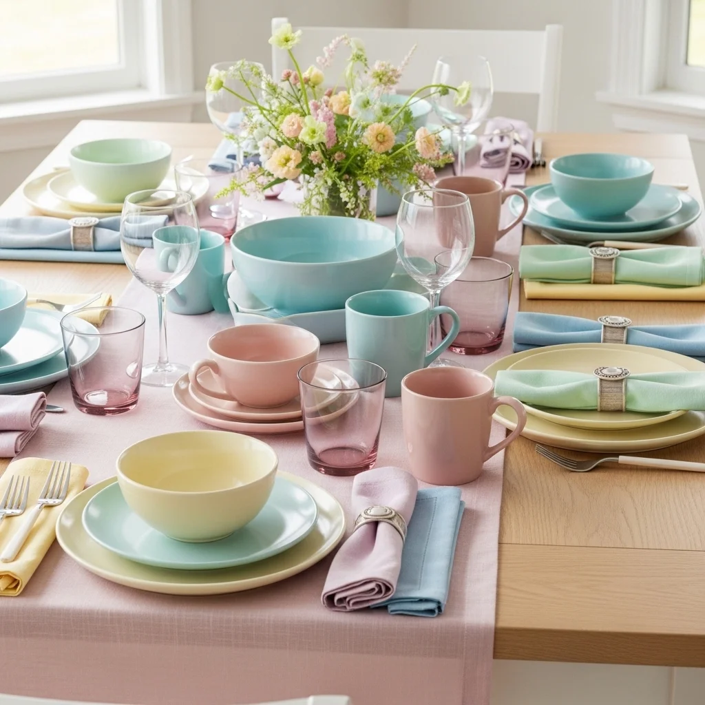 Redefine your dining experience with pastel dishware and table linens. From pastel dishes and glassware to soft runners and napkins, your dining table can transform into a calming yet stylish focal point.